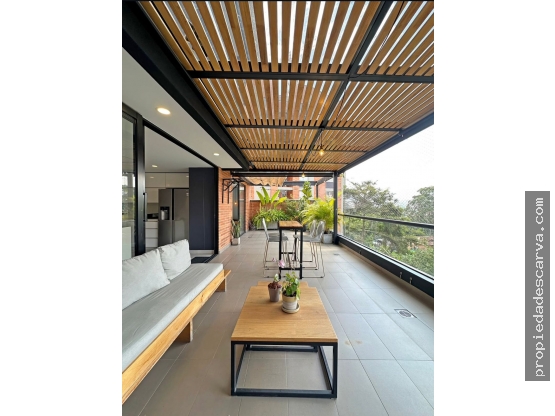 Distribuido en: Sala interior, terraza con sala exterior, cocina integral con barra americana incorporada, zona de ropas independiente, baño social; 2 alcobas: Principal con baño, closet y salida a la terraza; y alcoba auxiliar: con closet; cuenta con un parqueadero y un cuarto útil.