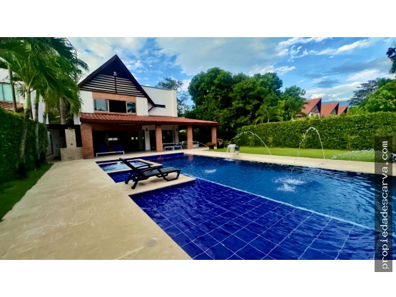 Cuenta con dos niveles 3 parqueaderos paralelos 4 alcobas cada una con closet y baño privado, Aire acondicionado en 2 alcobas y en área social, Cocina integral con isla, cuarto de servicio con baño, Comedor, Sala, Baño social, Sala antejardín cubierta, kiosco, Zona de BBQ, baño, Área de jardín y zonas verdes con piscina privada, tambien cuenta con